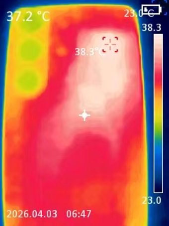 机身背面温度仅有38.3℃,而且在退出游戏后,手机在几分钟内就迅速凉了下来,这得益于它配备的大面积均热板,能够快速散热,再加上装甲铝机身进一步提升散热效率,从而保障高负载场景下的性能稳定输出。