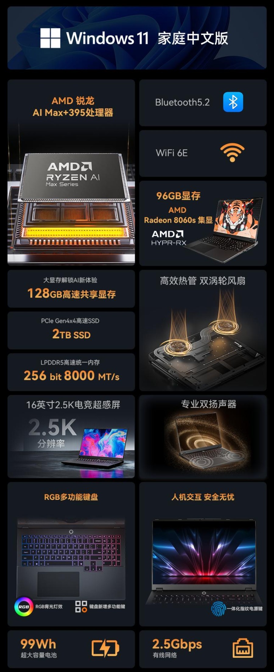 核心性能上,玄机16 2026搭载了AMD最新的Ryzen AI Max+ 395处理器,这颗处理器基于全新Zen 5架构打造,拥有16核心32线程的桌面级规格,单核最高加速频率可达5.1GHz,总缓存容量达到80MB。同时,该处理器集成了AMD XUNDA 2 NPU,AI算力高达50 TOPS,能够轻松实现AI大模型本地部署、AIGC内容创作、科学计算以及软件开发等复杂AI任务,一颗芯片即可满足各类复杂计算需求。核显性能实现了跨越式突破,该机配备了AMD Radeon 8060S集成显卡,基于RDNA 3.5架构打造,拥有40组CU共2560个流处理器,支持AMD HYPR-RX技术,最大可分配96GB显存,图形性能足以媲美主流移动端独立显卡,彻底打破了“核显只能办公”的刻板印象,能够流畅运行多款3A游戏大作。