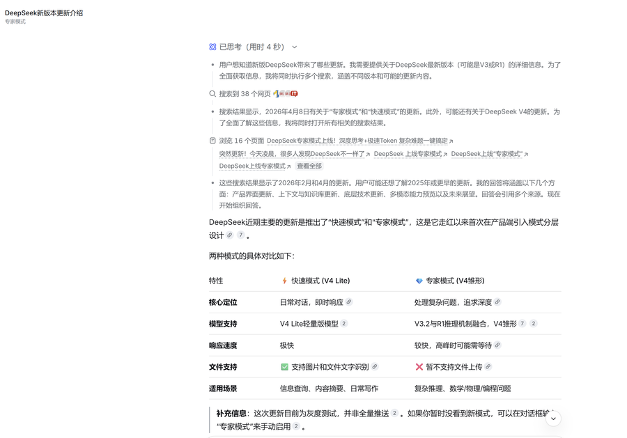 DeepSeek于2026年4月8日在网页版正式上线“快速模式”与“专家模式”选项,首次在产品端引入模式分层设计。快速模式主打日常对话与即时响应,支持图片和文件中的文字识别;专家模式则聚焦复杂推理、数学、物理及编程问题,当前暂不支持文件上传,高峰时段响应可能略有等待。