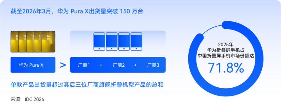 事实上,业界对于华为即将在华为Pura系列及全场景新品发布会上推出首款大阔折的猜测,并非空穴来风,而是建立在极其坚实的市场数据之上。根据市场调研机构IDC发布的最新数据,2025年华为Pura X的累积销量强势突破150万台,在高端折叠屏市场站稳了脚跟。这份百万级销量成绩,不仅印证了华为阔折叠方案的市场可行性,也充分体现出用户对华为折叠屏技术的高度信赖。