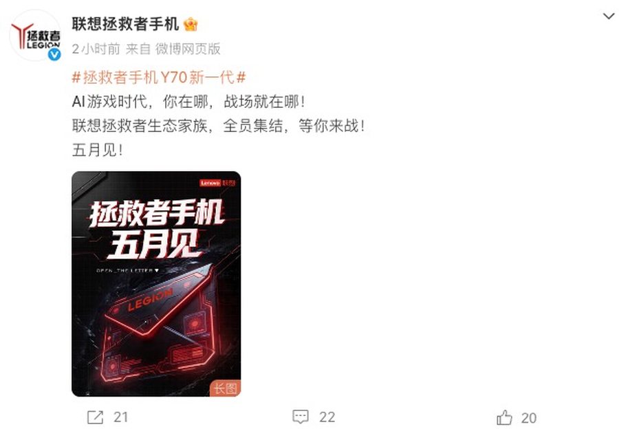 4月13日,拯救者官微正式宣布,拯救者手机Y70新一代将于五月份正式发布,这一消息标志着拯救者品牌正式重回手机赛道。