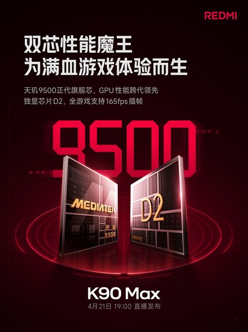 4月14日,REDMI官方正式官宣K90 Max定档4月21日19:00发布,定位「性能魔王」,主打极致电竞游戏体验,核心配置全面拉满,成为小米首款主动风冷旗舰,以双芯、高刷屏、超强散热、超大电池四大核心突破,重塑性能旗舰标准。
