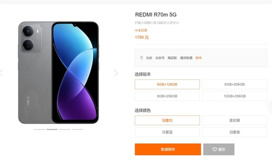 小米商城正式上架REDMI R70m新机,起售价1799元,定位实用型入门级5G机型,主打超长续航与大屏体验,兼顾性价比与实用性,面向注重日常使用体验的普通消费者,目前该机已在商城开启展示,暂未开售,显示为“敬请期待”状态。