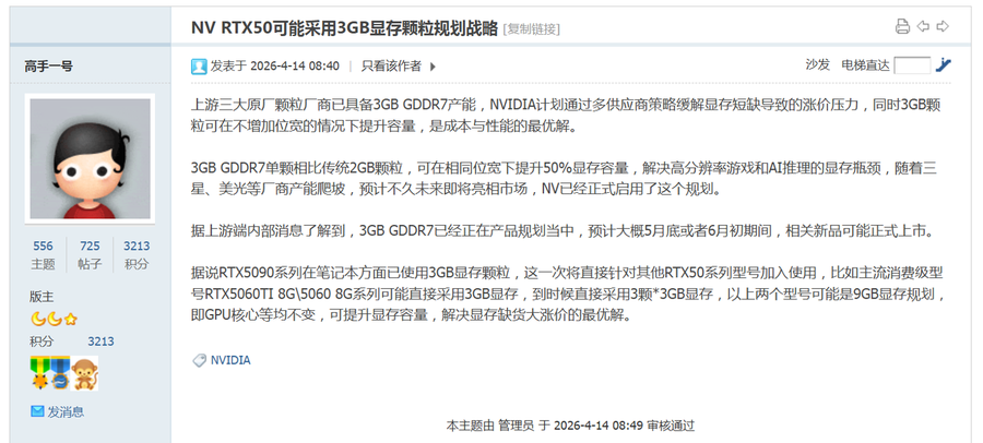 论坛用户“高手一号”于博板堂发布爆料,称英伟达将推出搭载9GB GDDR7显存的RTX 5060、RTX 5060 Ti显卡,新品最快将于5月底至6月初上市。爆料显示,三星、美光等上游三大显存颗粒原厂已具备3GB GDDR7显存颗粒的量产能力,英伟达计划通过多供应商策略,缓解此前显存短缺引发的产品涨价压力。相比行业主流的2GB单颗显存颗粒,3GB GDDR7颗粒可在不增加显存位宽的前提下,实现单颗容量50%的提升,既能适配高分辨率游戏与本地AI推理场景的显存需求,也被英伟达视作平衡产品成本与性能表现的最优方案。爆料同时提及,英伟达已正式启用3GB显存颗粒的产品规划,相关新品预计在2026年5月底至6月初正式亮相市场。