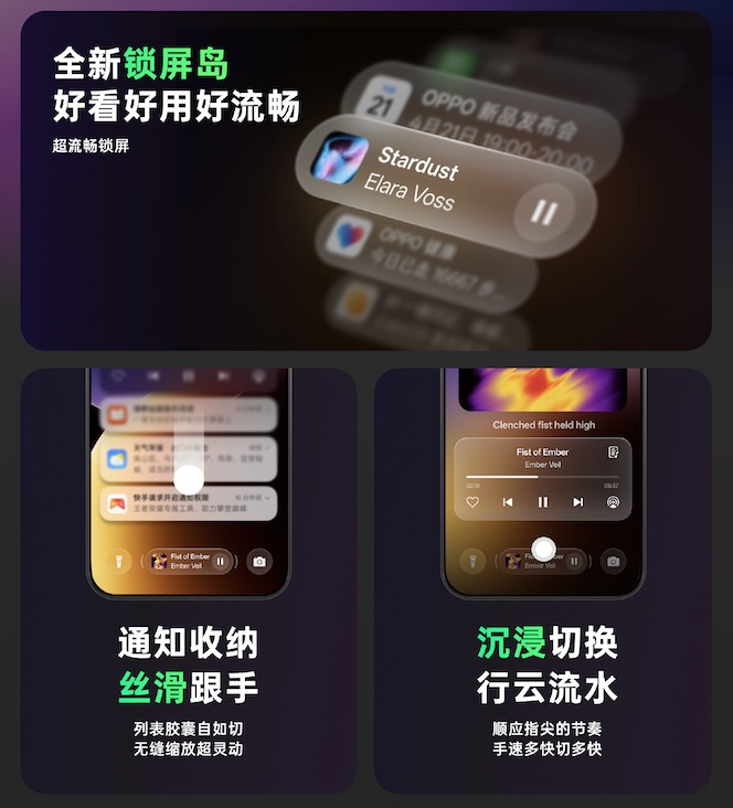 系统核心升级聚焦交互与 AI 场景:全新锁屏岛整合通知与流体云,支持自由展开收起、滑动切换,导航、音乐、计时等应用可在锁屏直接显示完整界面,无需解锁即可拖动音乐进度条、查看歌词,大幅提升锁屏效率。