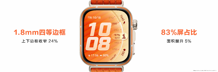 色彩搭配上,华为WATCH FIT 5推出韵律黑、悦动白、风信紫、光织银、向新绿五款活力配色,其中光织银款采用近乎100%再生尼龙表带与环保再生材质底壳,兼顾时尚与环保;华为WATCH FIT 5 Pro则带来丹霞橙、雅丹黑、冰川白三款潮酷配色,丹霞橙搭配云感呼吸编织表带,雅丹黑与冰川白采用立体棱纹设计,更适合户外场景。材质工艺上,Pro版堪称“越级”,首次将航天级纳米瓷金属工艺引入穿戴领域,冰川白款呈现陶瓷般温润触感与超高耐磨性,搭配2.5D蓝宝石玻璃镜面与钛合金表圈,防刮耐磨且质感出众,日常无惧有色液体泼溅,长久使用依旧如新。