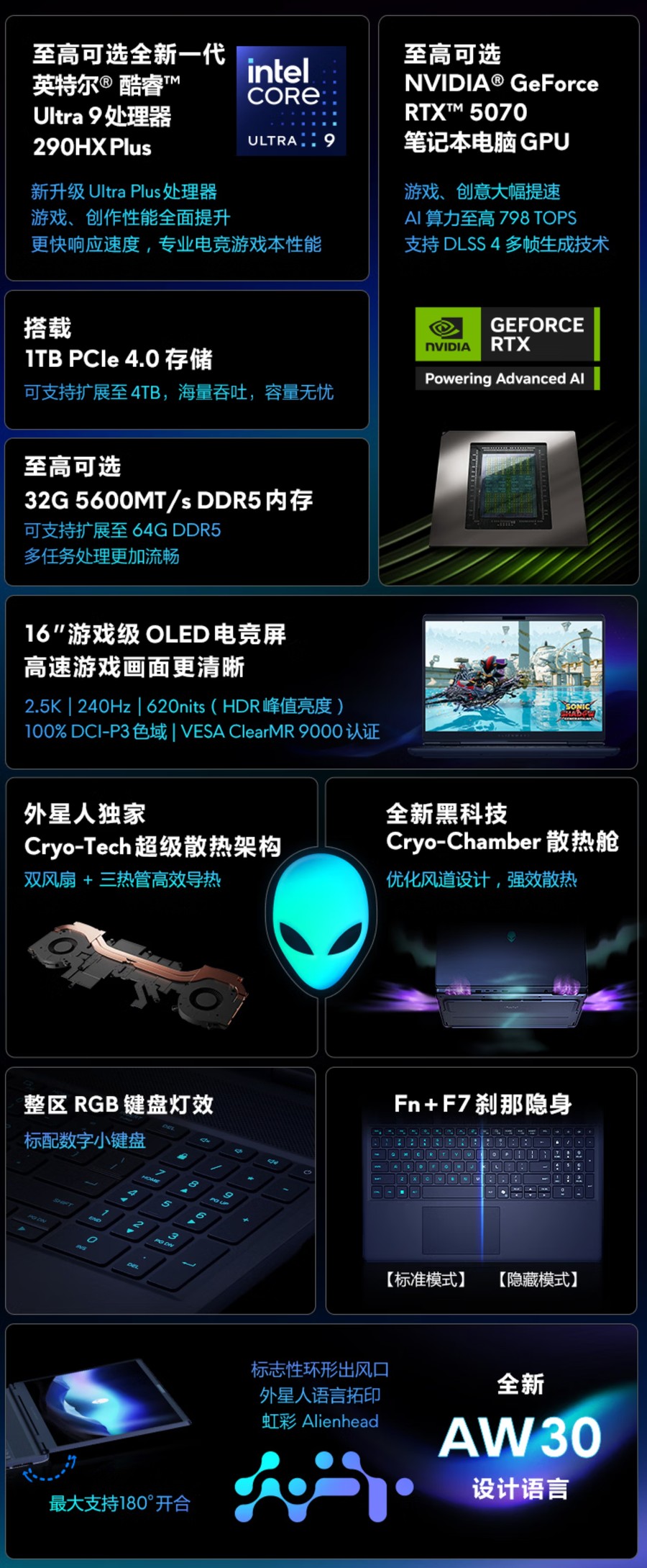 硬件配置上,Alienware 16X Aurora搭载英特尔“Arrow Lake Refresh”架构的酷睿Ultra 200HX Plus系列处理器,提供两款旗舰级配置选择:高配版Ultra 9 290HX Plus为8P+16E核心规格,24核心24线程;主流版Ultra 7 270HX Plus为8P+12E核心规格,20核心20线程。两款处理器均支持英特尔二进制优化技术,实现最高900MHz晶粒间频率提升,性能表现全面升级。机型全系标配RTX 5060显卡、32GB内存与1TB固态硬盘,其中Ultra 7版本首发售价17499元,Ultra 9版本首发售价19499元。