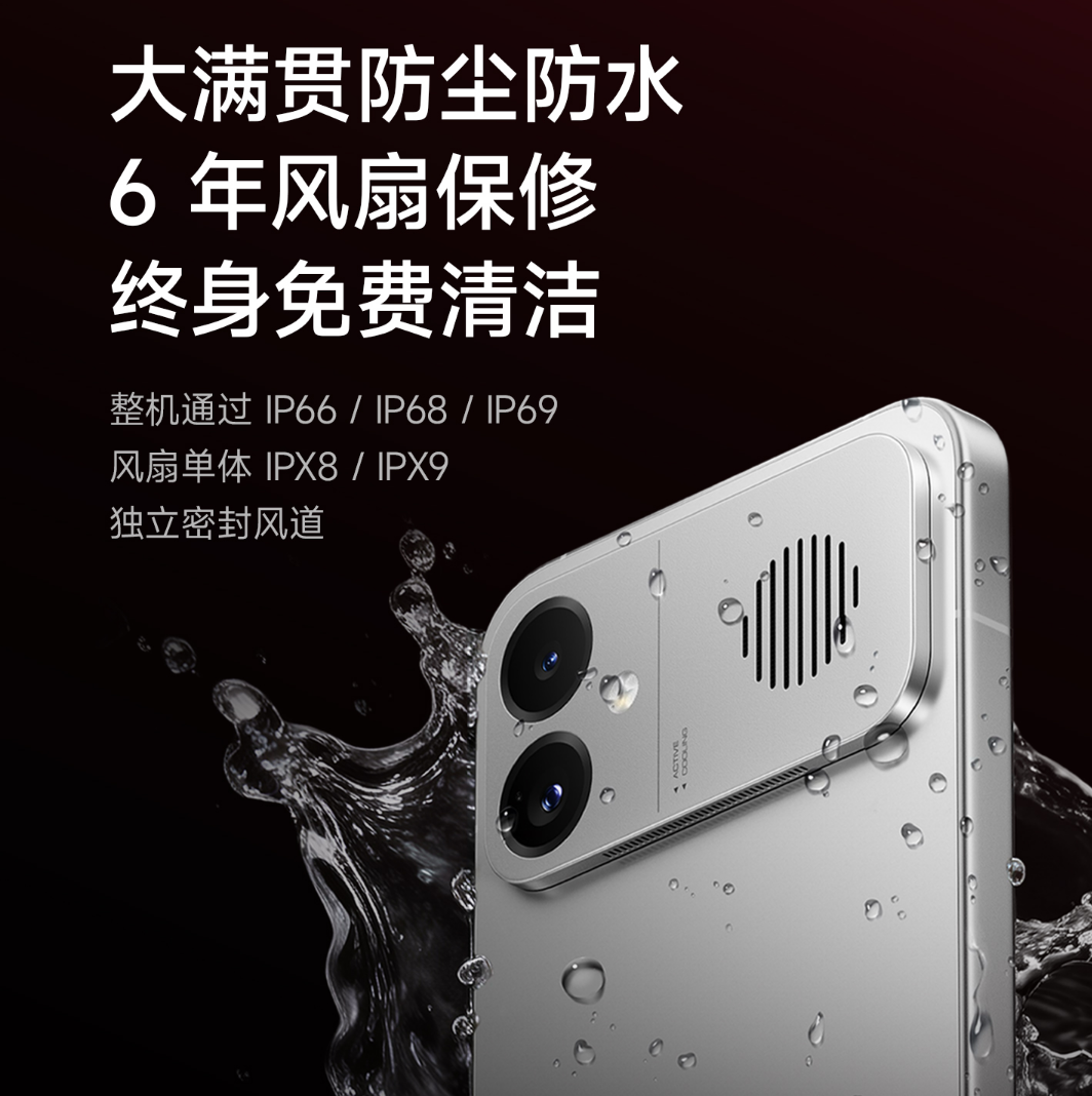 同时,散热系统支持自动、手动两模式及三档调节,全链路降噪处理让最大档位风噪仅32dB,相当于夜间睡眠环境底噪,静谧性拉满。值得一提的是,该机采用悬浮式风冷架构与独立密闭风道,不仅实现整机IP66/IP68/IP69K防尘防水大满贯,风扇单体更达到IPX8/IPX9防护等级,官方还提供6年风扇保修及终身免费清洁服务,彻底打消用户使用顾虑。