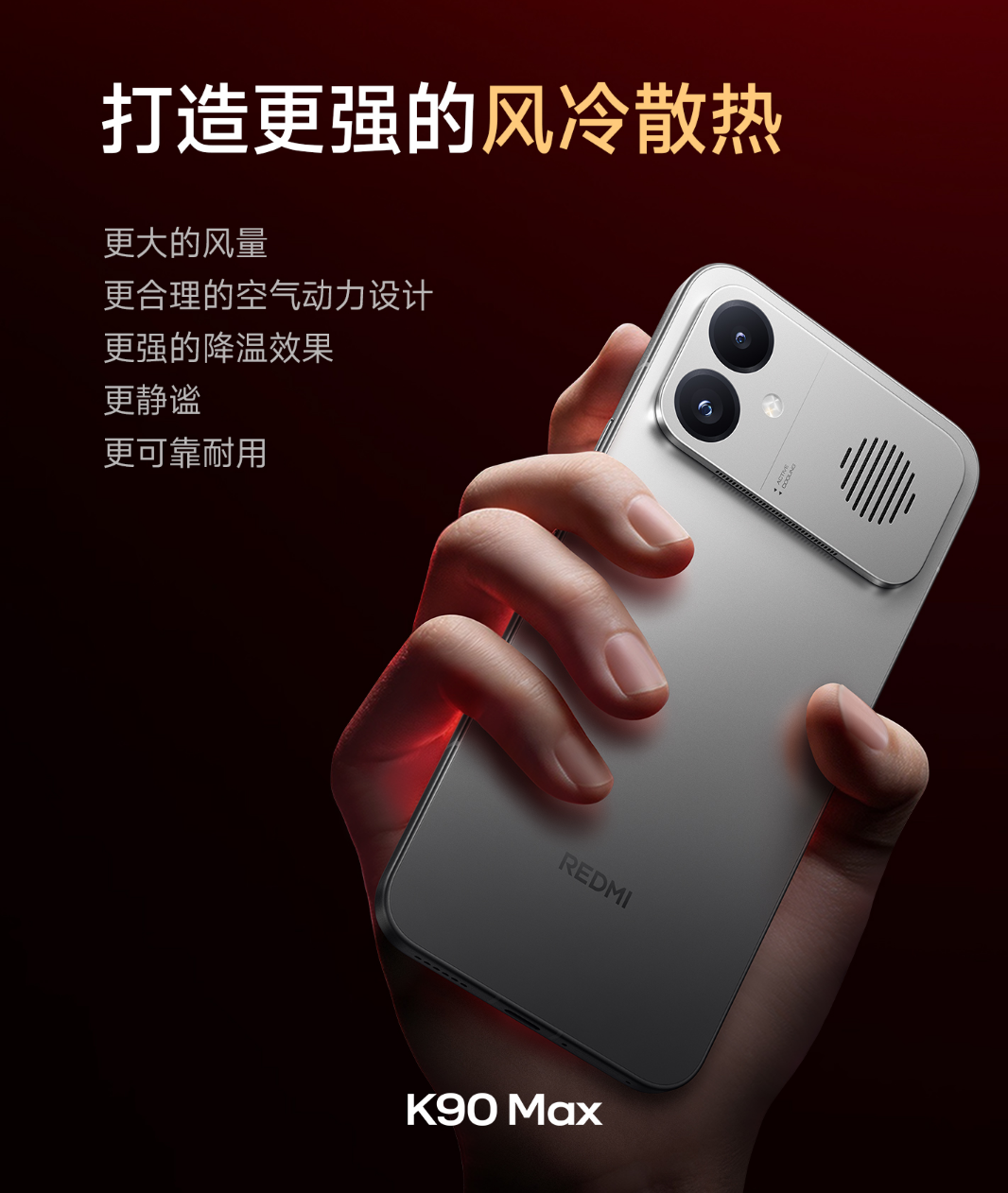 2026年4月21日,REDMI正式举办新品发布会,推出K系列全新成员——K90 Max。作为小米首款搭载主动风冷散热的旗舰手机,该机以“风冷双芯,性能魔王”为核心定位,聚焦重度手游玩家需求,在散热、性能、屏幕、续航等维度全面升级,叠加多重补贴后2549.15元起售,重新定义2500-4000元价位段游戏性能旗舰的标杆水准。