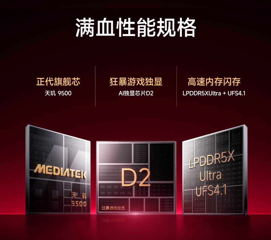 性能方面,REDMI K90 Max搭载天玑9500正代旗舰芯片与AI独显芯片D2的双芯组合,辅以LPDDR5X内存与UFS 4.1闪存,实验室综合跑分高达416万分。AI独显芯片D2则实现全游戏165FPS插帧支持,可完成百款游戏1.5K+165FPS超分超帧并发。