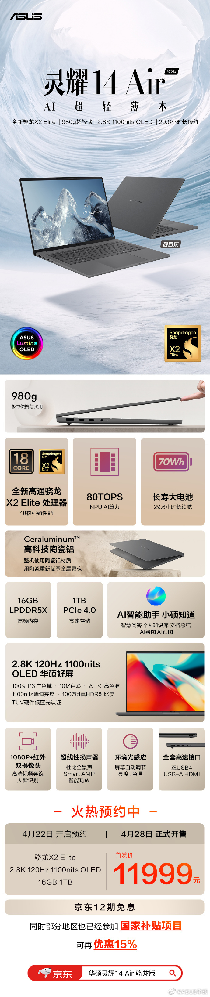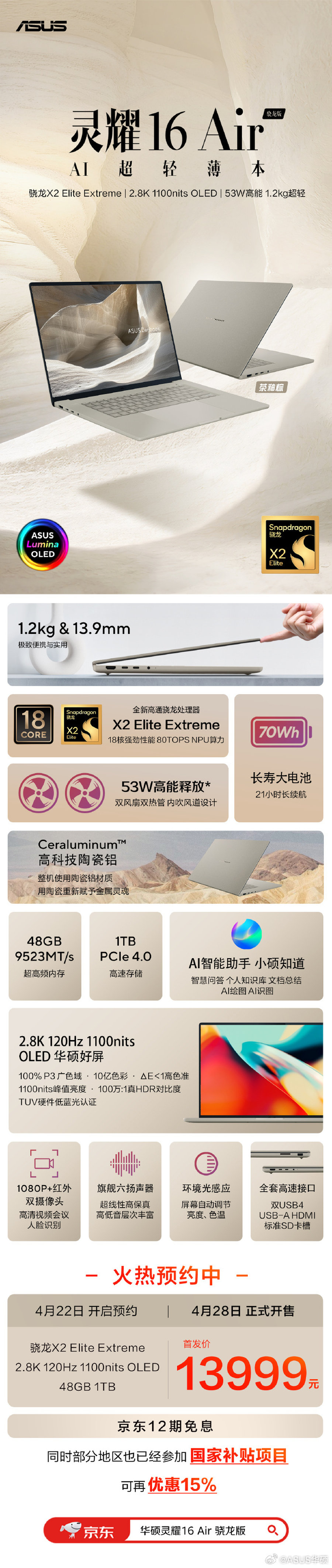 华硕正式推出灵耀Air系列全新骁龙版AI超轻薄本——灵耀16 Air骁龙版与灵耀14 Air骁龙版。两款新品均搭载高通骁龙X2系列旗舰处理器,依托高通骁龙平台的强劲性能与AI算力优势,在极致轻薄机身、高素质屏幕与长续航体验上实现全面升级,为移动办公、内容创作等多元场景带来全新选择,两款产品已于发布当日同步开启预约。华硕灵耀16 Air骁龙版与灵耀14 Air骁龙版均于4月22日正式开启预约,4月28日全渠道正式开售。其中灵耀16 Air骁龙版首发定价13999元,灵耀14 Air骁龙版首发定价11999元。两款新品均支持白条12期免息,部分地区还可享15%国补。