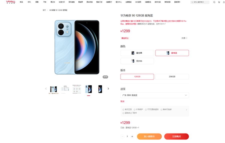 今日,华为畅享90正式开售,共提供128GB和256GB两种存储版本,售价分别为1299元和1599元,以亲民价位带来全面升级的使用体验。