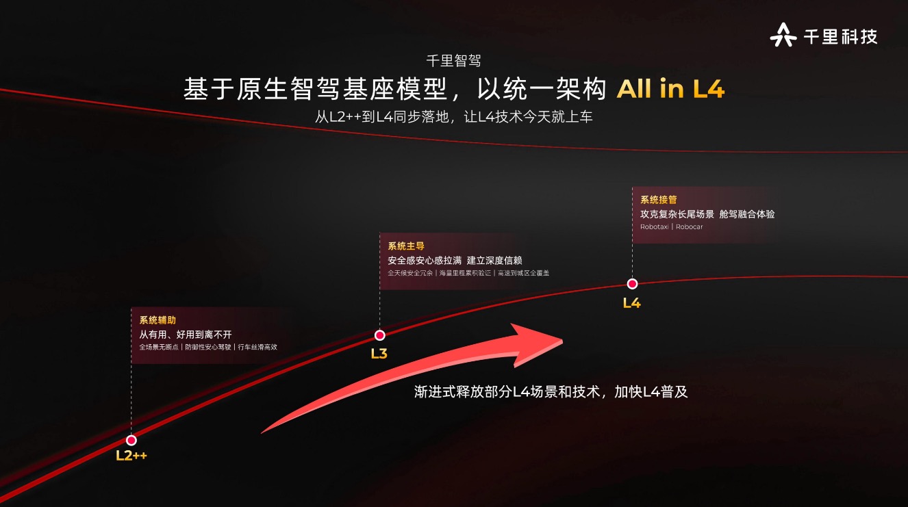 在商业化落地层面,千里科技明确2027年推出全套Robotaxi解决方案,2030年目标全球搭载超30万辆。同时,公司宣布助力新汽车品牌PALLADE游心落地,定价区间20万-40万,覆盖城市与越野车型,将L4架构与超级智能体下沉至主流市场。