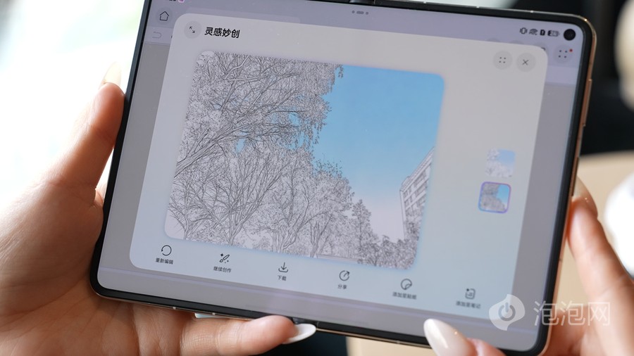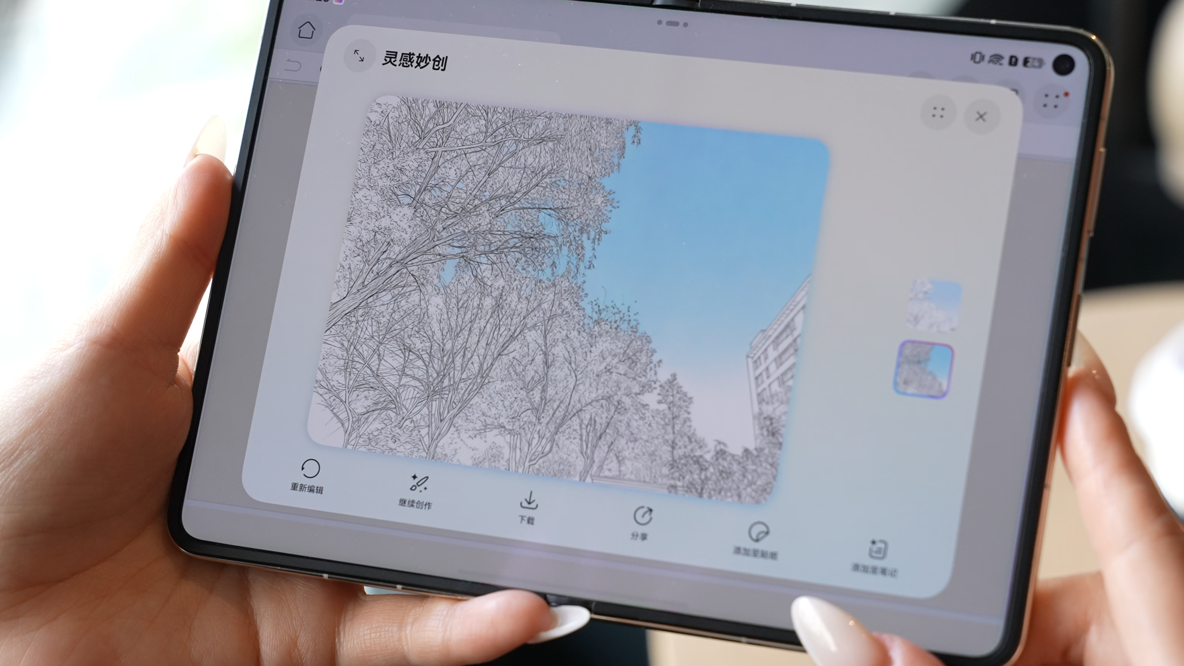 AI创作功能也很强,华为笔记里的AI灵感妙创只要随手涂鸦、拍张照片,就能生成表情包、日常穿搭、家装效果图,手残党也能秒变设计师。它还在手机上首发天生会画App,各种笔刷都有,随手画画、给照片加创意,可玩性很高。