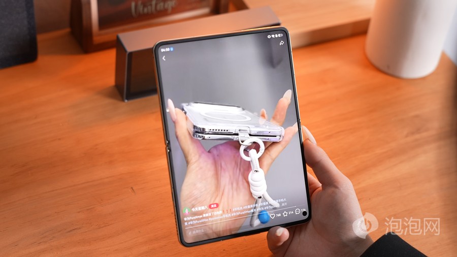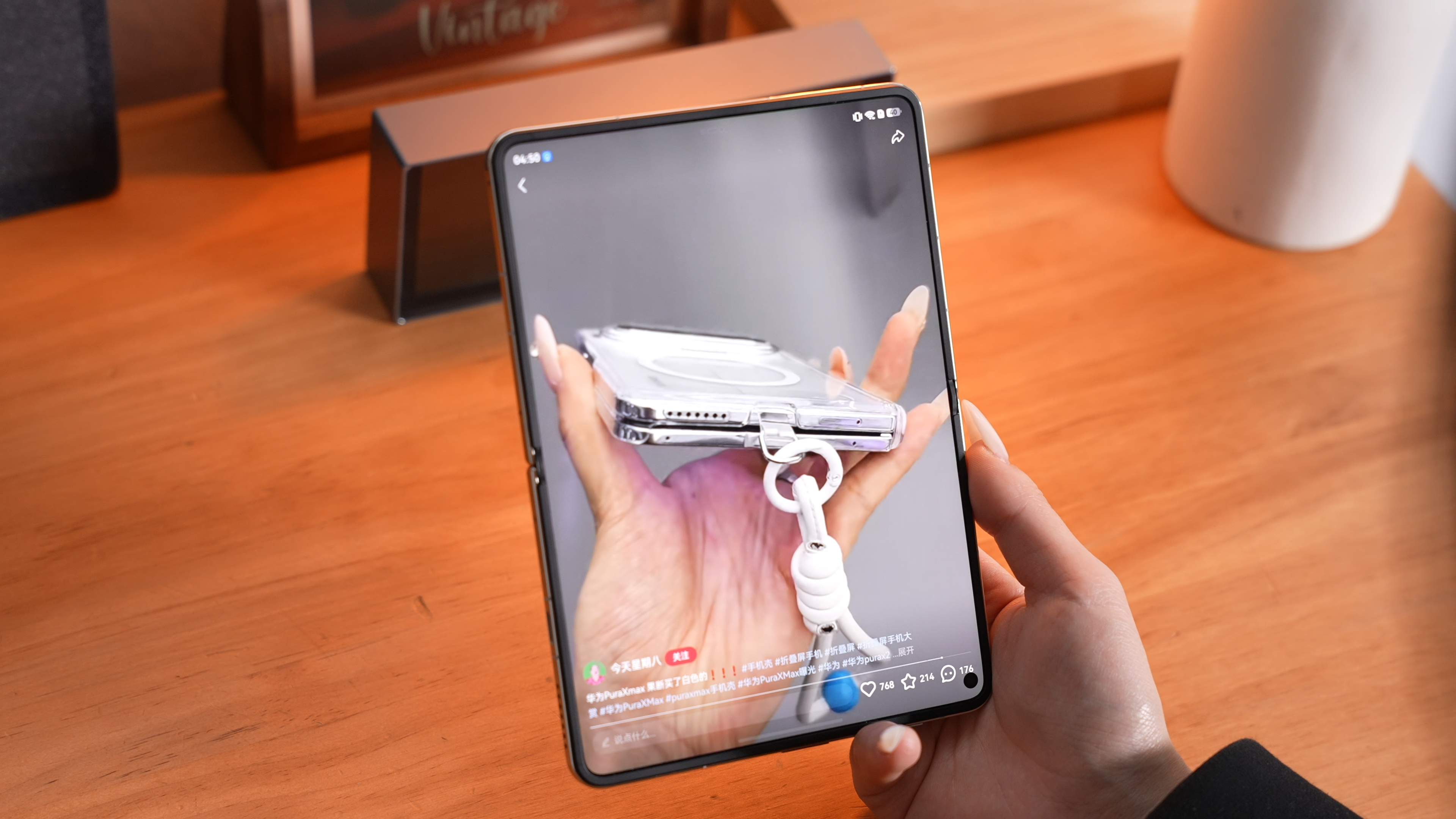 既然叫“大阔折”,在尺寸上它和去年的Pura X就有很大区别,完全是另一条赛道。外屏5.4英寸,内屏7.7英寸,都是接近A4纸的黄金比例,看内容特别舒服,相比二折叠那种几乎方形的内屏,阔型屏能充分利用起屏幕空间,显示更多内容。