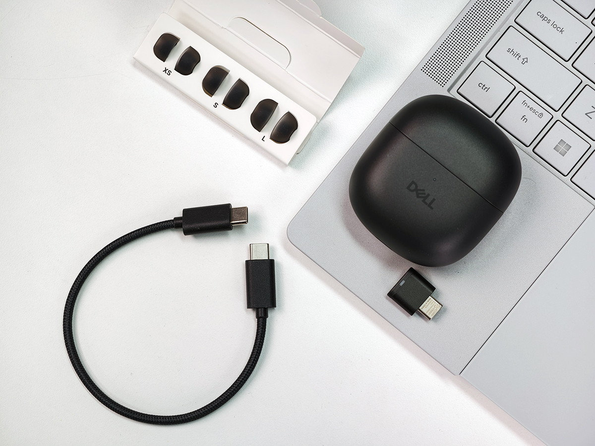 Dell Pro Plus入耳式耳机EB525采用全黑哑光材质,触感细腻,不易沾染指纹,同时设有细微通风孔,兼顾透气性与佩戴贴合度。充电盒同样为磨砂材质,体积小巧,开合阻尼适中,内置收纳槽可牢固固定耳机与无线接收器,方便携带与收纳。