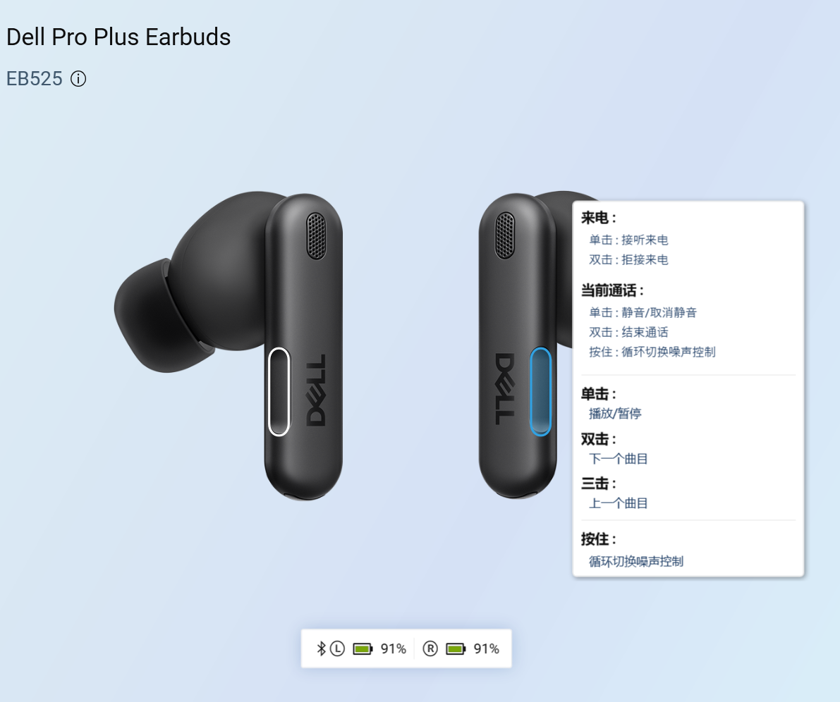 Dell Pro Plus入耳式耳机EB525的续航能力完全适配职场人的全天使用需求:开启ANC模式下,单耳可连续聆听8小时、通话5小时;搭配充电盒,总续航可达33小时(聆听)/16.5小时(通话),足以满足全天办公+差旅出行的使用需求,无需频繁充电。