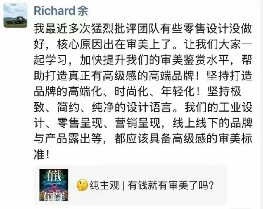 此前,余承东在朋友圈中对团队的设计工作表示不满,直言问题的核心在于审美不足。最近,他在一次公开直播中进行了自我检讨和批评,强调了这一问题的重要性。