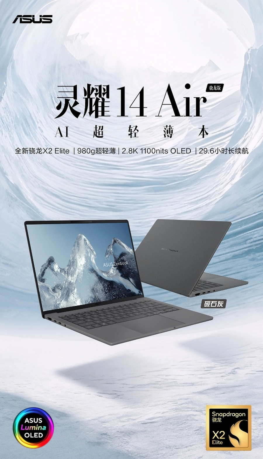 4 月 27 日,华硕正式推出三款全新 AI PC 产品,包含灵耀 16 Air 骁龙版、灵耀 14 Air 骁龙版与 ProArt 创 X 2026,全系标配骁龙 X2 Elite 系列旗舰平台,凭借新一代芯片的制程优势、性能释放、超低功耗与强悍 AI 算力,打破传统轻薄本性能瓶颈,为移动办公、专业创作带来全方位升级,重塑高端 AI 轻薄本核心标准。