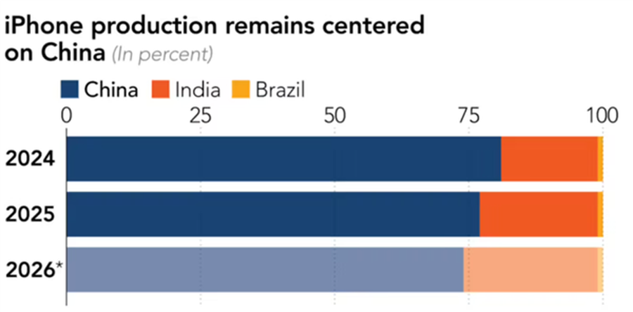 相关数据显示,2025年印度iPhone组装份额约占全球22%,所产机型主要供应美国市场。按照苹果此前的预期,这一份额在2026年将有显著提升,但目前来看,预计仅能小幅升至25%,远未达到前期设定的目标。